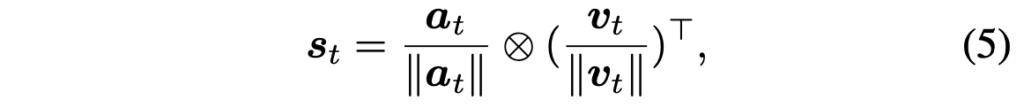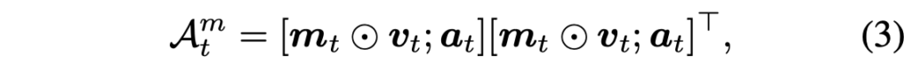 여기까지 하여 얻은 \textbf{m}_{t}는 N^{2}차원으로, 각 패치 영역에 대한 salient object의 가중치라고 볼 수 있습니다. 따라서 이를 원본 visual feature v_{t}에 원소곱(Hadamard product)한 뒤 오디오 feature a_{t}를 뒤에 concat 후 아래와 같은 형태의 motion-driven 인접 매트릭스 \mathcal{A}_{t}^{m} \in{} \mathbb{R}^{(N^{2}+1) \times{} (N^{2}+1)}을 만들어줍니다.