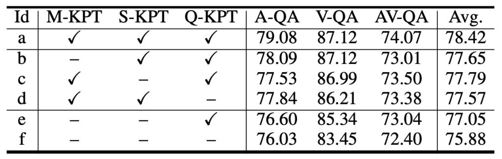 위 그림 3은 S-KPT 모듈에서 집중하는 ‘소리와 연관된 부분’, M-KPT 모듈에서 집중하는 ‘움직임과 연관된 부분’, 그리고 Q-KPT에서 집중하는 ‘질문과 연관된 부분’을 시각화한 것입니다.