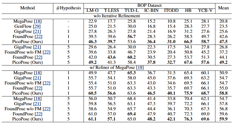 PicoPose는 가설을 1개만 사용한 경우와 5개를 사용한 경우 모두에서 다른 모델들을 큰 차이로 능가하는 SOTA 성능을 달성했습니다. 예를 들어, 5개의 가설을 사용했을 때 후처리가 없는 PicoPose는 GigaPose보다 22.4%, FoundPose보다는 5.1% 높은 AR 점수를 기록했습니다. 이러한 정량적 결과는 아래 fig에서 시각적으로도 뒷받침되는데, 다른 모델들에 비해 PicoPose가 훨씬 정확하게 자세를 추정하는 것을 확인할 수 있습니다.