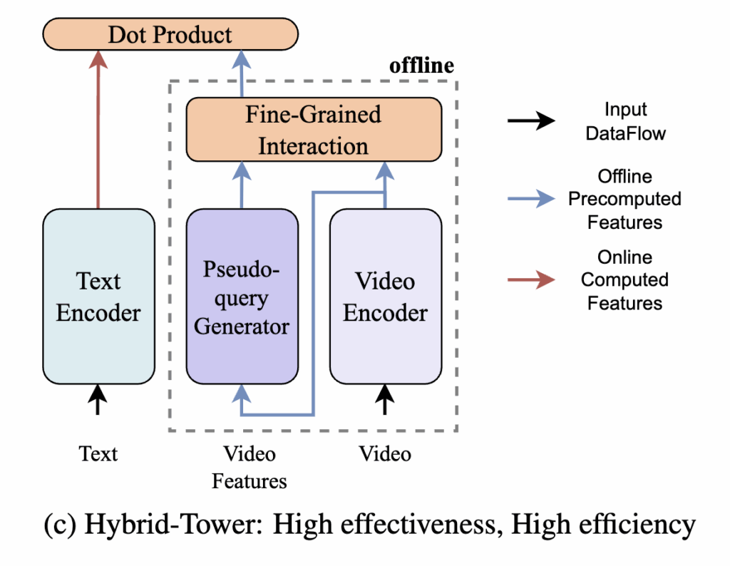 따라서 저자는 이러한 두 접근의 장점을 결합하여, 정확성과 효율성을 동시에 달성할 수 있는 새로운 Hybrid-Tower 프레임워크를 제안합니다. 이 프레임워크의 핵심은 Pseudo-query Interaction and Generation(PIG)인데, 이는 실제 텍스트 쿼리가 주어지기 전에 비디오와 관련된 pseudo-query를 생성하여, 비디오 피처가 Single-Tower 모델처럼 pseudo-text 쿼리와 상호작용을 수행할 수 있도록 합니다.