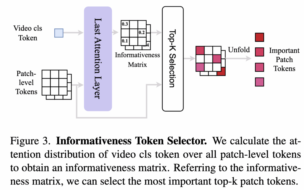 ITS는 비디오의 [CLS] 토큰이 각 patch-level token에 대해 계산한 attention score 중 top-k 토큰만을 선택합니다.