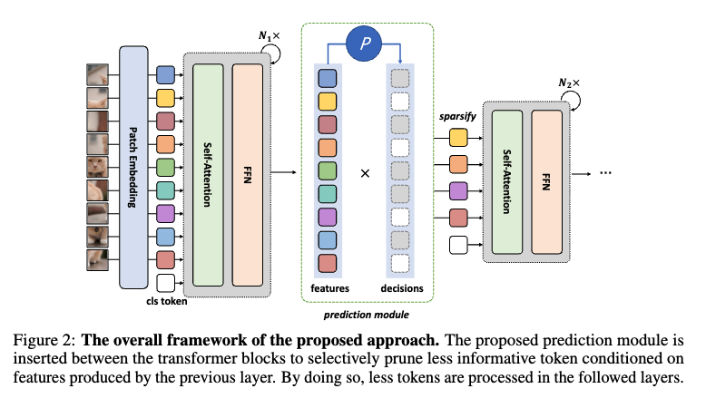일단 CNN에서는 보통 중요도가 낮은 필터를 pruning하는 방식을 많이 썼다고합니다. 반면에 ViT는 이미지를 여러 개의 독립적인 패치(토큰)로 나눠 처리하기 때문에 프루닝을 하는데 있어서 CNN과는 다르게 바로 덜 중요한 토큰 자체를 버리는 방식으로 접근이 가능해집니다.