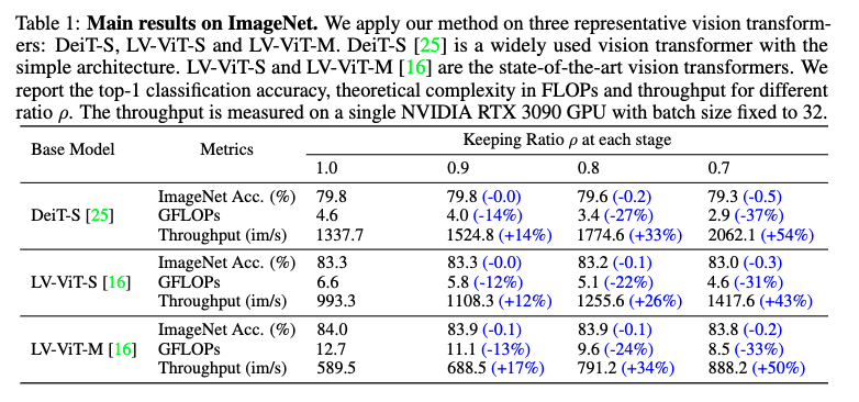 일단 실험은 DeiT와 LV-ViT 같은 여러 Vision Transformer를 기반으로 진행되었고, 토큰은 3단계에 걸쳐 점진적으로 제거됩니다. 예를 들어서 keep ratio p를 0.7로 설정했다면, 1단계 후에 70%, 2단계 후에 49%(0.72), 3단계 후에는 약 34%(0.73)의 토큰만 남게 되는 식이라고 보시면 될 것 같습니다.