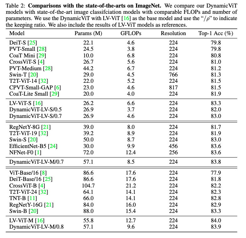 먼저 위 표를 보시면 성능 하락은 거의 없는데 속도는 엄청나게 빨라졌습니다. DynamicViT는 연산량(FLOPs)을 31% ~ 37%나 줄이고, 추론 처리량(Throughput)은 43% ~ 54%나 향상시켰습니다. 이렇게까지 효율을 높였는데도 불구하고 정확도 하락은 고작 0.2% ~ 0.5% 수준인 것을 확인 하실 수 있습니다.