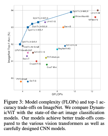 표 2와 그림 3의 비교 결과를 보면, DynamicViT는 기존의 강력한 CNN 모델인 EfficientNet-B5나 NFNet-F0보다도 더 적은 연산량으로 더 높은 정확도를 달성한 것을 확인 할 수 있었습니다.