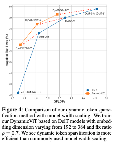 위 표를 보시면 단순히 작은 모델을 쓰는 것보다, 큰 모델에 DynamicViT를 적용하는 것이 훨씬 효율적이라는 것을 볼 수 있습니다. 어떻게 보면 성능을 올려놓고 거기서 프루닝을 해서 프루닝한 결과와 동일한 연산량을 가지는 모델과 비교를 하는 것이죠. 예를 들어, 중간 크기 모델인 DeiT-256에 DynamicViT를 적용했더니, 연산량은 가장 작은 모델인 DeiT-Ti 수준으로 줄어들었는데, 정확도는 무려 4.3%나 더 높았습니다. 즉, 같은 비용이라면 더 똑똑한 모델의 불필요한 부분만 덜어내서 쓰는 게 훨씬 낫다는 것을 보여줍니다.