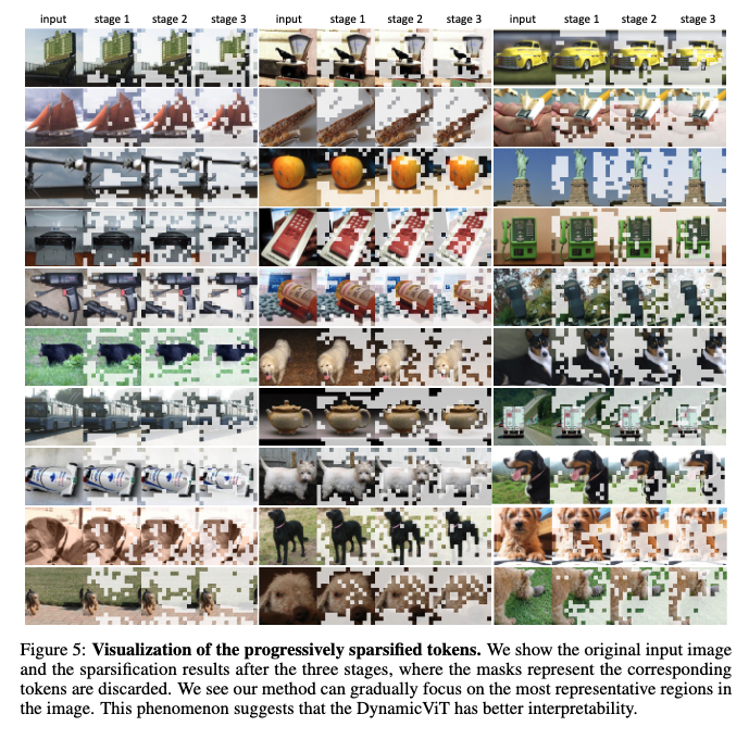 위는 토큰 프루닝 과정을 시각화해서 보여준 것입니다. 위 표를 보시면 모델이 여러 단계를 거치면서 이미지의 배경(하늘, 바닥 등)처럼 정보량이 적은 토큰은 점차 버리고, 최종적으로는 핵심 객체(새, 강아지 등)에만 집중하는 모습을 확인할 수 있습니다. 저자는 DynamicViT가 단순히 연산량만 줄이는 게 아니라, 모델의 판단 과정을 단계별로 추적할 수 있어서 해석 가능성까지 보여준다고 합니다. 실제로 후속 연구들을 보면 각 레이어별 모델이 어느 부분을 더 집중해서 보는 지를 분석하고 해석하면서 프루닝을 레이어에 맞게 한다거나, 혹은 재활용한다던지를 고려해서 프루닝을 합니다. 토큰 프루닝에 있어서 통계, 그리고 그에 대한 분석이 중요한데 이는 추후 토큰 프루닝을 어떻게 더 효율적으로 할 수 있을지를 생각할 수 있도록 하는 시각화 결과라고 생각합니다.