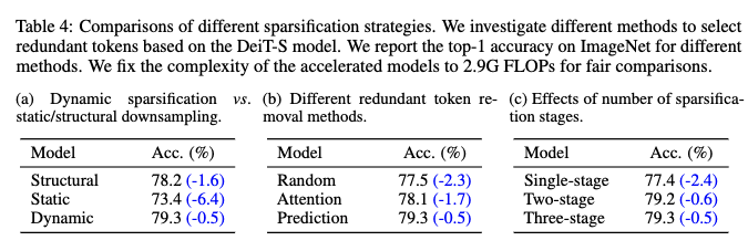 여기서 structure는 CNN이 하듯이 중간에 풀링 레이어를 추가해 토큰 수를 줄이는 방식이고,static은이미지 내용과 상관없이 항상 정해진 위치의 토큰을 버리는 방식입니다. 그리고 무작위로 토큰을 버리거나, 어텐션 점수를 기반으로 버리기 등 다른 방법들도 비교 대상에 포함되었습니다.