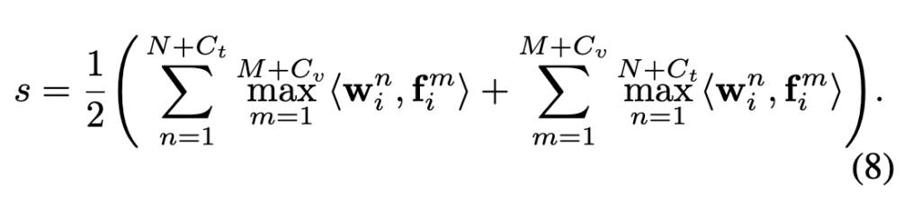 해당 논문에서는 그중 단어–프레임(word-frame) 단위 매칭 방식을 사용했습니다. 즉, 텍스트의 각 단어 임베딩과 비디오의 각 프레임 임베딩 간 유사도를 모두 계산한 뒤, 양방향으로 최대 유사도를 평균내는 방식으로 전체 텍스트–비디오 유사도를 계산합니다.