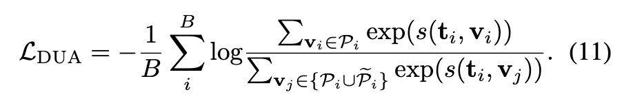 DUA는 텍스트와 비디오를 단일 벡터가 아닌 확률 분포로 표현합니다. 즉, 문장 t_i와 비디오 v_i를 각각 평균 \mu와 분산 \sigma를 가진 정규분포로 모델링하여,