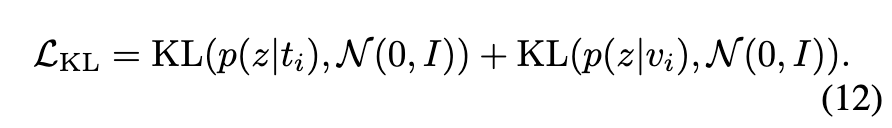 구체적으로, 학습된 확률 분포 p(z|t_i)와 p(z|v_i)가 표준 정규분포 \mathcal{N}(0, I)와 지나치게 멀어지지 않도록 제약을 주는 방식이며, 다음과 같이 정의됩니다.