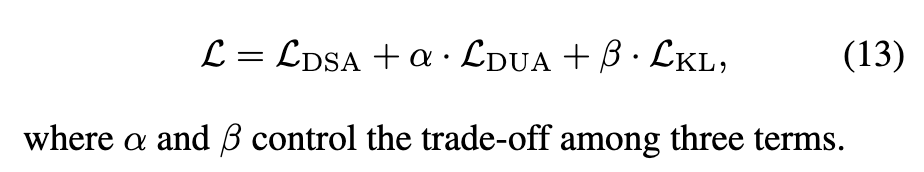 최종 학습 Loss는 지금까지 제안된 세 가지 Loss 인 Dynamic Semantic Adaptation(DSA), Adaptive Distribution Matching(DUA), 그리고 KL Regularization를 함께 결합한 형태입니다.