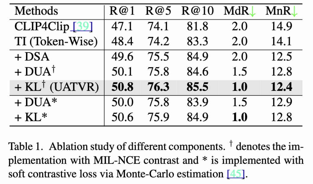 Table 1은 UATVR의 각 구성요소가 성능에 미치는 영향을 보여줍니다. 기본 구조인 Token-wise Interaction(TI) 은 R@1 48.4%를 기록했으며, DSA 추가 시 49.6%, DUA 적용 시 50.1%로 향상되었습니다. 최종적으로 KL 정규화 항까지 포함한 UATVR 전체 모델은 R@1 50.8%, MdR 1.0, MnR 12.4로 최고 성능을 달성했습니다.