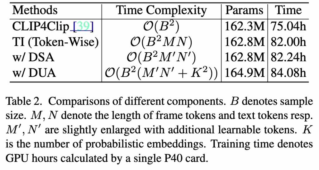Table 2는 각 구성요소가 계산 복잡도와 학습 비용에 미치는 영향을 비교한 결과입니다. 기존 CLIP4Clip 대비, Token-wise Interaction(TI) 과 DSA, DUA 모두 약간의 연산량 증가가 있지만, 여전히 한 쌍의 텍스트–비디오 입력에 대해 이차 시간 복잡도(quadratic time)에 머물러 있었다고 합니다.