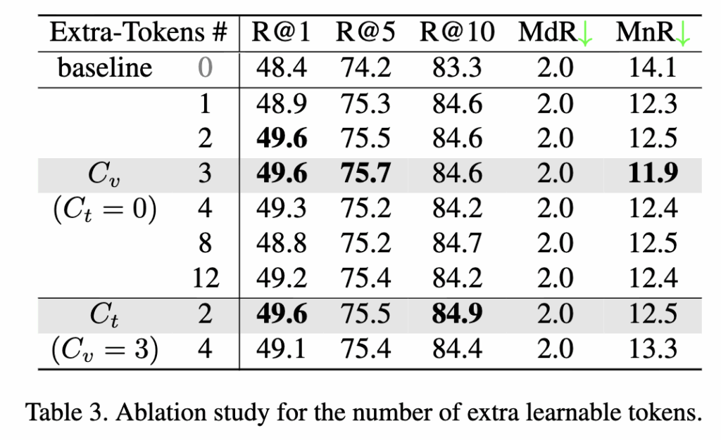 추가로 텍스트 쪽 토큰 C_t = 2를 더했을 때도 R@1 49.6%, R@10 84.9%로 적절한 개선을 보였습니다. 결과적으로 저자들은 최종 실험 설정을 C_v = 3, C_t = 2 로 설정하였습니다.