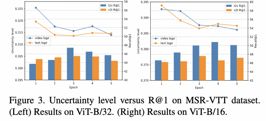 Figure 3은 불확실성 수준(uncertainty level) 과 R@1 성능 간의 관계를 시각화한 결과입니다. 비디오와 텍스트의 표준편차 σ로 계산한 불확실성이 감소할수록, R@1 성능이 꾸준히 향상되는 경향을 보였습니다. 이는 제안된 DUA가 모델이 학습 중 불확실성을 줄여가며 표현력을 높여줍니다.