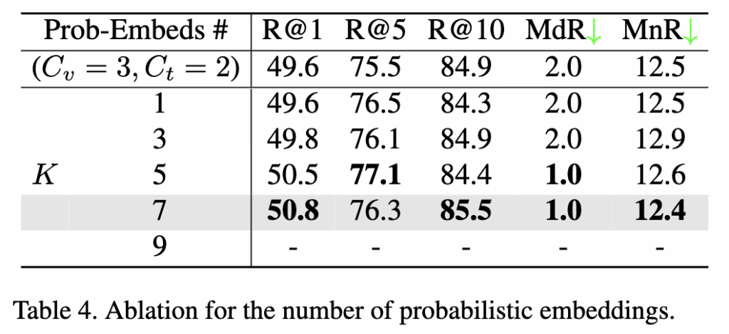 Table 4는 확률 임베딩 수 K에 따른 성능 변화를 보여줍니다. 확률 샘플 수가 많을수록 텍스트–비디오 간 분포를 더 정교하게 모사할 수 있지만, 계산량도 함께 증가합니다.
