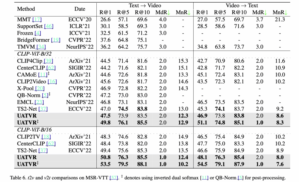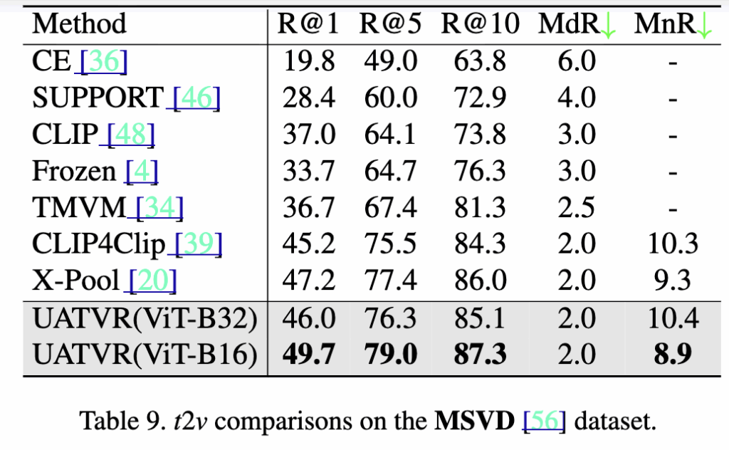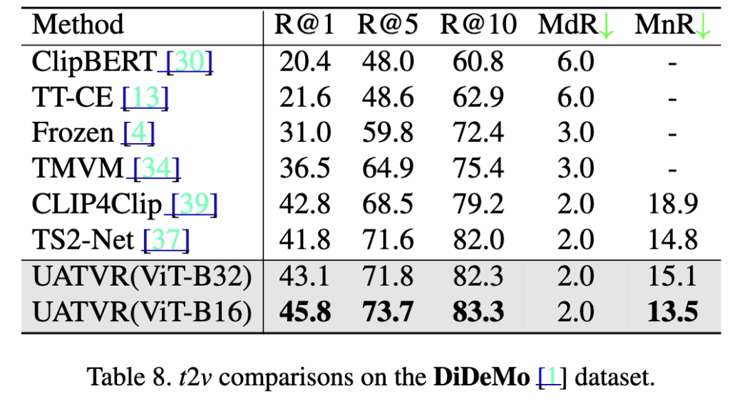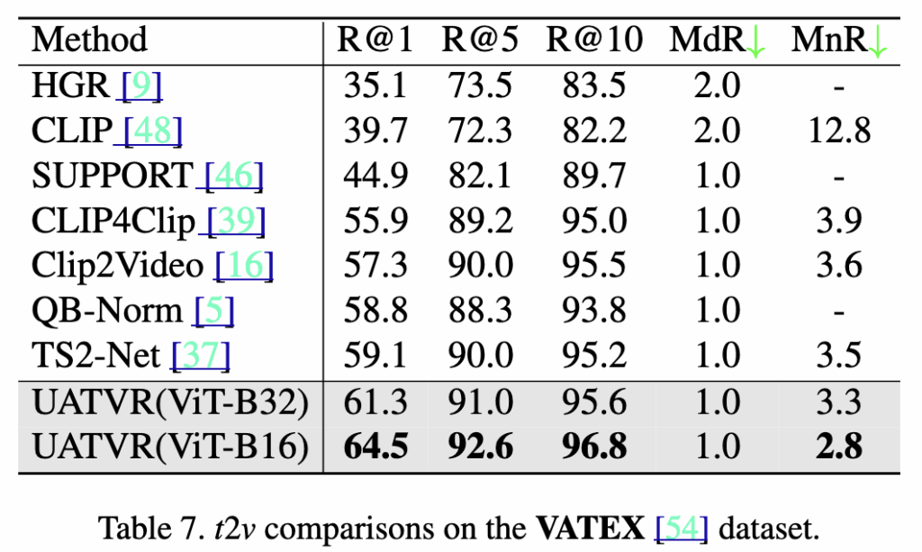 기존 최고 성능인 TS2-Net(R@1 59.1%)을 크게 넘어, UATVR(ViT-B/16) 은 R@1 64.5%, MnR 2.8로 SOTA를 달성했습니다.