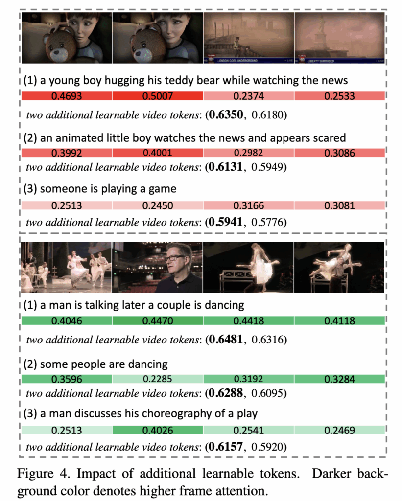 베이스라인 대비 추가 토큰을 도입하면 텍스트와 의미적으로 더 관련된 프레임에 높은 attention weight를 부여함을 확인할 수 있었는데요, 예를 들어, “some people are dancing”, “a man discusses his choreography of a play” 같은 문장에서 UATVR은 해당 장면(춤추는 프레임 등)에 집중하는 반면, 기존 모델은 덜 관련된 프레임에 분산됨. 즉, 텍스트 의존적 비디오 의미 집약(semantic aggregation) 이 향상된 것을 확인할 수 있었습니다.