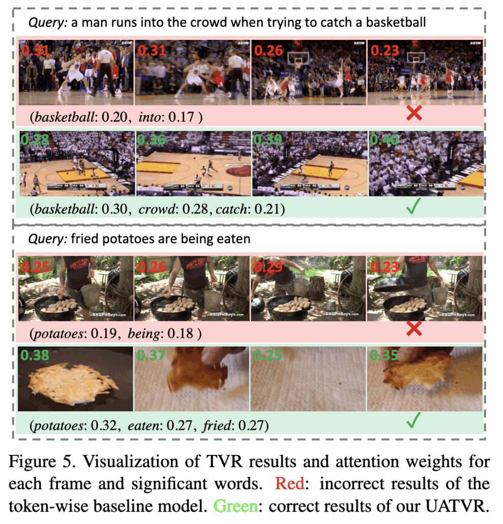 baseline은 basketball, potatoes 등 특정 단어에만 집중해 local context matching에 그치는 것을 볼 수 있는데요. 반면 UATVR은 crowd, fried, eaten 등 여러 개의 단서를 포착해, 복합적 (high-level) 추론 능력 을 보여주었습니다.