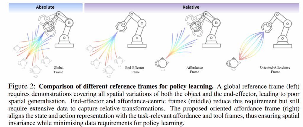 이를 해소하기 위한 방법으로 relative coordinates를 사용하는 방법입니다. 예를 들어 로봇의 행동을 현재 end-effector에 상대적으로 표현(fig 2-2번째)하거나, 작업 관련된 물체의 자세를 end-effector에 상대적으로 표현(fig2-3번째)하는 방법으로 볼 수 있습니다. 이러한 표현은 일반화 문제를 어느 정도 완화시킬 수 있지만 여전히 각각 물체의 모든 자세를, 로봇의 모든 자세를 포함하는 시연 데이터를 요구하게 됩니다.