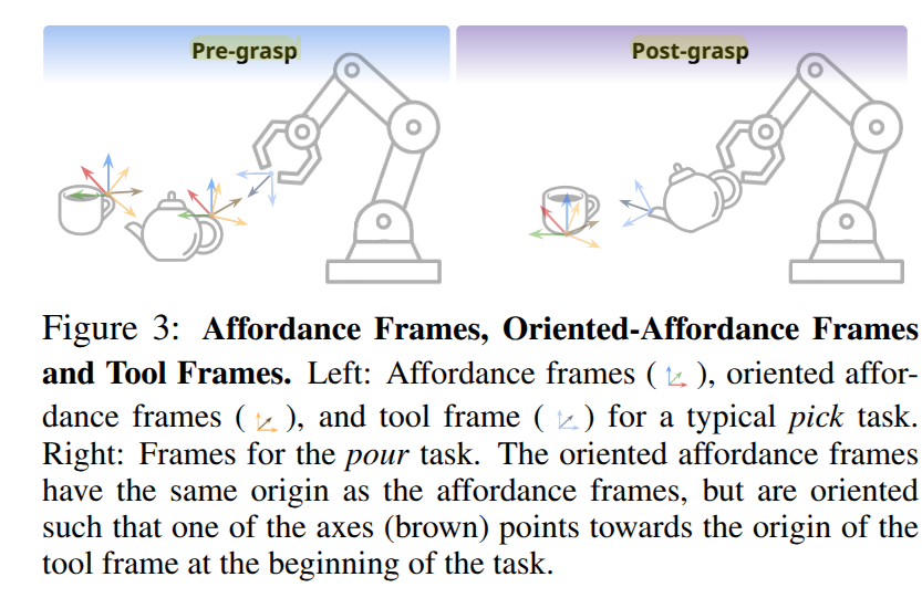 fig 2에서 ee-frame은 ee를 원점으로 작업 객체를 표현하는 방법, affordacne frame은 객체의 affordacne를 원점으로 보는 방법으로 볼 수 있습니다. 근데 여기서 문제가 다시 생겨요. 두 방법 모두 원점이 아닌 대상은 자유롭다는 문제가 발생합니다.