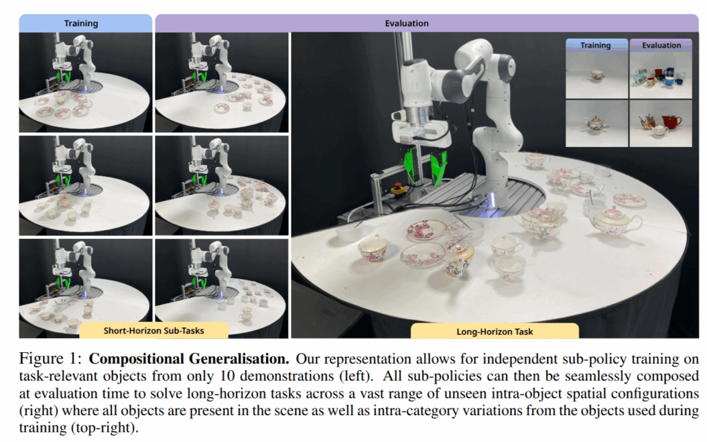 실생활에 로봇이 자율 작업을 수행하기 위해서는 로봇이 차를 준비하거나, 커피를 만들거나, 방을 청소하는 것과 같이 복잡하고 장기적인 작업을 해결해야 합니다. 이러한 작업은 여러 객체 간의 상호 작용을 조정하고 시간 경과에 따라 구조화된 작업 시퀀스로 구성되어 수행되어야 하빈다. 최근 policy learning이나 large-scale demonstration collection의 발전으로 low-level manipulation의 발전을 보이지만, 여전히 샘플 효율성과 구성 일반화에 어려움을 가지고 있습니다. 이러한 어려움은 장기 작업의 일반화를 보장하기 위해서는 길고 단일 궤적에 대한 다양성을 확보한 비현실적인 대규모 시연 데이터를 요구하게 되기 때문이라고 볼 수 있죠.