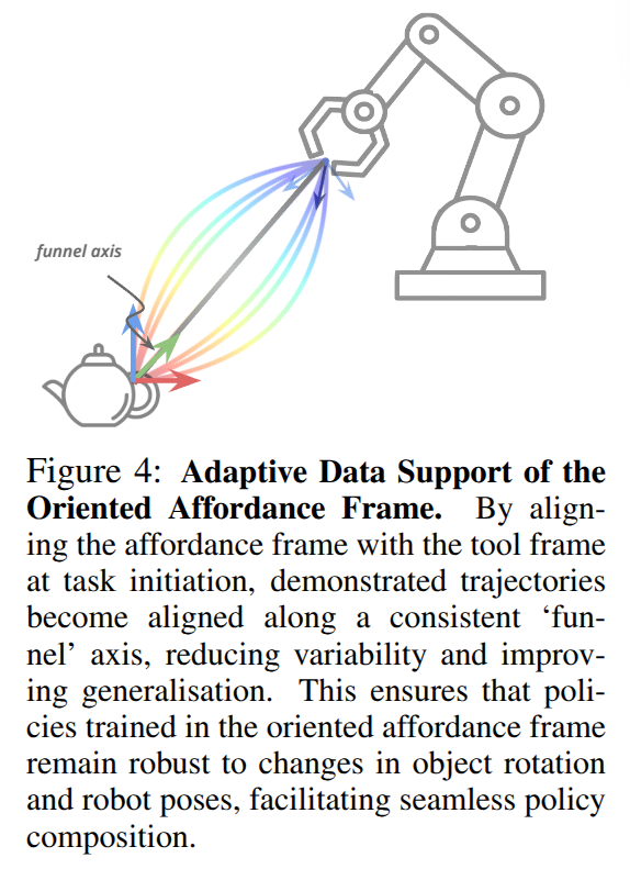 Intuitive Benefits of the Oriented Affordance Frame: 저자는 해당 표현이 적은 수의 시연으로도 효과적이라고 주장합니다. 이는 fig 4를 보면 어드 시원 궤적이든간에 “funnel axis”의 근처로 정렬되는 경향을 볼 수 있습니다. 즉, 여러 정책을 구성해도 작업이 끝날 때 로봇의 tool frame이 항상 분포 내에 있도록 보장 할 수 있습니다.