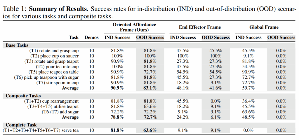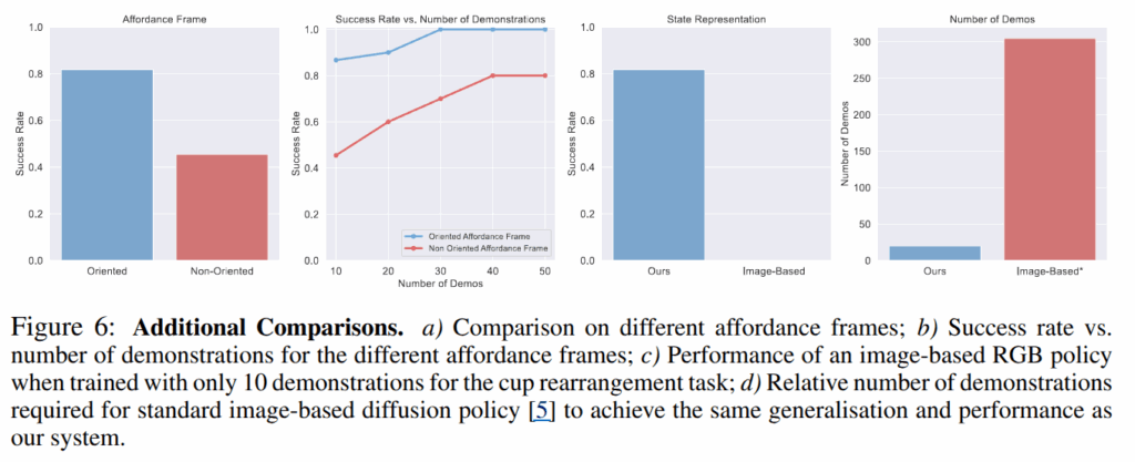 또한, real world experiment를 통해서 affordacne-centric approach이 sub-task 당 단 10 demo만으로도 샘플 효율적인 정책 학습이 가능함을 보이며, 기존 기법 (영상 기반, global frame)보다 뛰어남을 보여줍니다.