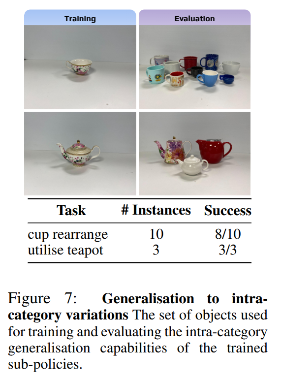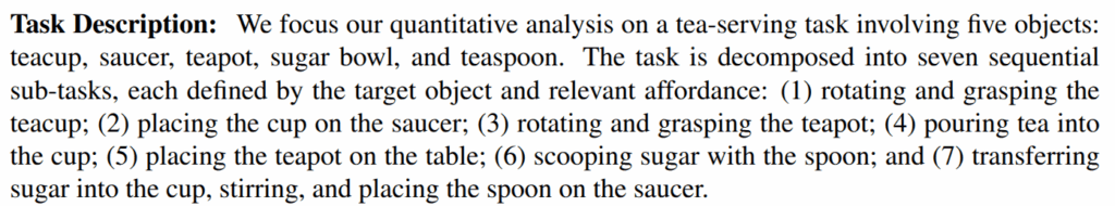 해당 실험에서는 fig 5와 같은 실험 세팅을 통해서 장기 작업을 구성했습니다. 대표적인 장기 작업은 tea making을 수행했습니다. 해당 장기 작업은 아래와 같은 7가지 하위 작업으로 분해하여 평가를 진행합니다.