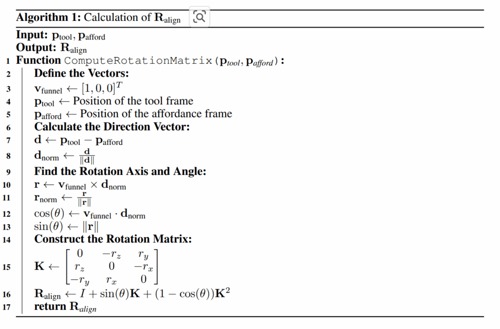Frame Initialisation and Update: 각 작업 시작 전에 oriented affordance frame을 초기화 합니다. perception pipeline은 affrodance frame \mathbf{T}^W_{afford} \in SE(3) 를 추출합니다. 그리고 로봇의 forward kinematics과 쥐고 있는 도구 객체에 대한 지식을 기반으로 tool frame \mathbf{T}^W_{tool} \in SE(3) 의 포즈를 구할 수 있습니다. 그리고 나서 alg 1을 통해서 x 축이 tool frame의 원점을 향하도록 하는 회전 행렬 \mathbf{R}_{align} 를 계산하여 \mathbf{T}_{o-aff} = \mathbf{R}_{align} \cdot \mathbf{T}_{afford} 를 생성합니다.