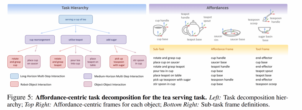 저자는 이러한 문제점을 해소하기 위해서 affordance-centric perspective를 활용합니다. 먼저, 다중 객체들이 포함된 장기 작업을 어포던스에 맞춰진 하위 작업으로 분할합니다. 각 하위 작업들은 찻 주전자로 따르거나 컵을 잡는 것과 같이 국소적인 객체 상호 작용에 따른 정의로 구분됩니다. 이러한 분해는 기능적으로 구별가능한 상호 작용에 초점을 맞춘 하위 정책의 독립적인 훈련을 가능하게 합니다.