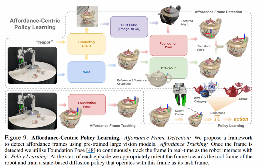 (2) We develop a perception pipeline that leverages pre-trained vision foundation models to detect and track these affordance frames without reliance on fiducial markers, supporting real-world deployment.