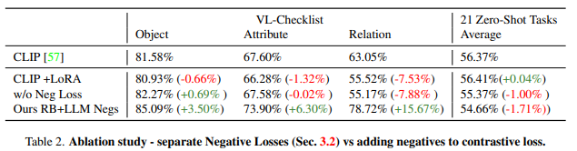 Negative Loss를 추가하는 것으로 모델은 원래의 텍스트와 증강된 Negative 텍스트와의 구별력을 더 확실하게 얻을 수 있습니다. 이 Negative Loss를 추가하는 것으로 모델이 SVLC에 대한 이해를 기를 수 있습니다.
