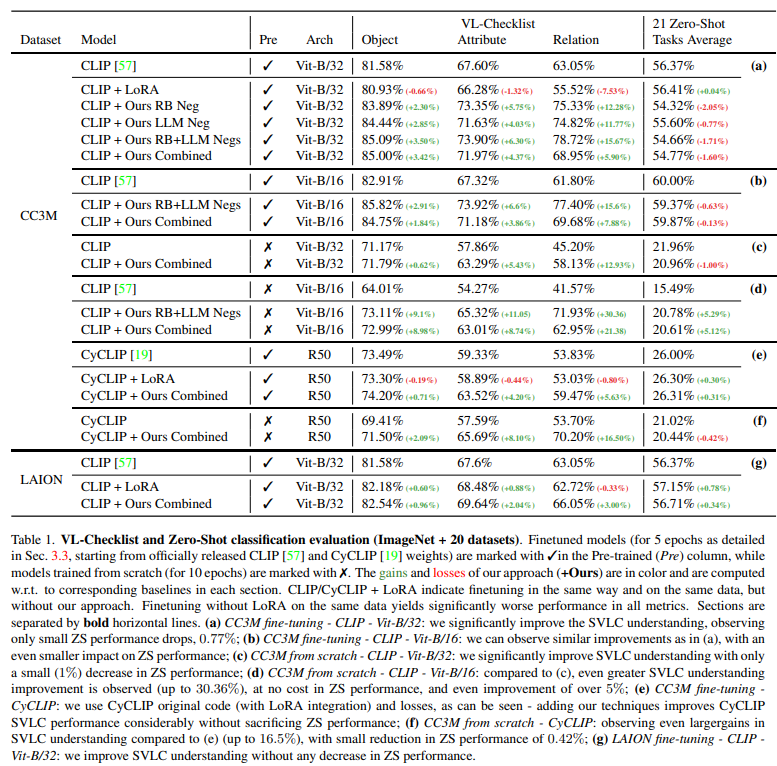 2. 평가 task 관련하여, VL-Checklist는 pos, neg에 대한 이진 분류 정확도, 21 zero-shot은 이미지 분류 정확도가 맞나요? 그렇다면 표 1 (a)를 보았을때 CC3M 데이터셋에 대해서만 저자들의 방법론으로 학습하고 VL-Checklist 데이터들에 대해서는 별도로 학습하지 않는 것인지 궁금합니다.
