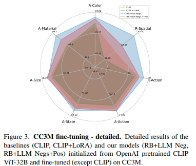 Figure 1은 저자가 제안하는 추가적인 학습 방법을 보여주는 그림입니다. 예를 들어 “회색 고양이가 플라스틱 의자 위에 앉아 있다”라는 문장이 주어지면 “회색”을 “루비색”으로 바꿔 잘못된 캡션을 생성하여 NEG로 학습하면 모델이 자연스럽게 고양이의 색깔 개념을 학습할 수 있습니다. 마찬가리고 “플라스틱”을 “나무”로 바꿔서 의자의 재질 개념을 학습할 수 있고 같은 의미의 다른 단어로 구성된 문장을 학습하는 것으로 SVLC에 대한 이해력을 높일 수 있습니다. 저자는 추가로 LoRA를 사용하여 미세조정하는 것으로 모델의 기존 지식을 훼손하지 않고 SVLC 개념을 학습할 수 있습니다.