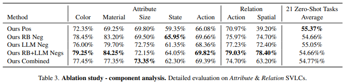 표2 는 Ablation Study입니다. Negative Loss를 사용해야 특히 Relation에서 성능이 많이 오르는 것을 확인할 수 있고 저자가 제안하는 Negative Loss를 추가하는 것이 Zeroshot 성능은 약간 하락하지만 전반적인 모델의 SVLC 성능을 향상시키는 데에 효과적임을 보이고 있습니다. 하락폭에 비해 상승폭이 높다는 점을 저자는 강조하고 있습니다.