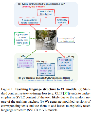 CLIP과 같은 Vision-Language 모델은 이미지와 텍스트를 함께 학습하는 것으로 Classification, Detection, Segmentation 등의 다양한 task에서 zeroshot 수행이 가능하며 zeroshot으로도 높은 성능을 달성했습니다. 하지만, VLM을 학습하는 contrastive learning의 특성 상 복합적인 언어 이해 능력에는 아직 한계가 존재합니다. 특히 객체의 속성(색, 재질, 크기 등)과 객체의 상태 그리고 객체들 사이의 관계(공간적 위치 관계, 행동의 주체-대상 관계 등)에 대한 이해를 필요로하는 Structured Vision & Language Concepts (SLVC) 개념은 VLM에 어려움이 있습니다. 이러한 Compositional Understanding이 약한 이유로 VL 모델이 학습하는 contrastive learning이 object bias가 있기 때문입니다. contrastive learning은 무작위 배치에서 이미지-텍스트 쌍을 맞추게 되는데 이때 한 배치 내에 동일한 객체의 구성을 가지고 있을 확률이 낮기 때문에 모델이 이미지나 텍스트를 단순히 객체들의 모음으로만 이해해도 충분하기 때문입니다. 또한 특성과 관계를 라벨링한 데이터셋도 많지 않기 때문에 학습에도 한계가 있습니다. 즉, 기존의 VLM은 객체 식별에는 강하지만 객체들의 특성이나 상호 관계를 구분하는 것은 약합니다. 저자는 이를 해결하기 위한 새로운 학습 방식을 제안합니다.