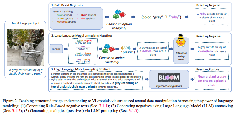 따라서 저자는 추가 데이터 없이 VLM의 SVLC 이해 능력을 향상하는 데이터 기반의 접근법을 제안합니다. 저자의 아이디어는 다음과 같습니다. 이미지의 구조적 이해는 여전히 어렵지만 언어의 구조는 비교적 잘 학습되므로 이 언어의 구조에 대한 이해력을 바탕으로 VLM의 SVLC 능력을 향상시키는 것입니다. 언어의 구조를 잘 알고 있는 LLM을 활용하여 기존 이미지-텍스트 쌍의 텍스트를 manipulate하는 것으로 모델이 텍스트에 내재된 SVLC 정보를 학습할 수 있도록 하는 방법입니다. 구체적으로는 텍스트의 정보를 증강하여 원본 텍스트와 같은 의미를 갖는 POS 문장과 속성이나 관계가 다른 조작된 NEG 문장을 활용한 hard negative를 활용한 학습을 통해 모델이 SVLC 정보를 잘 이해할 수 있도록 학습합니다.