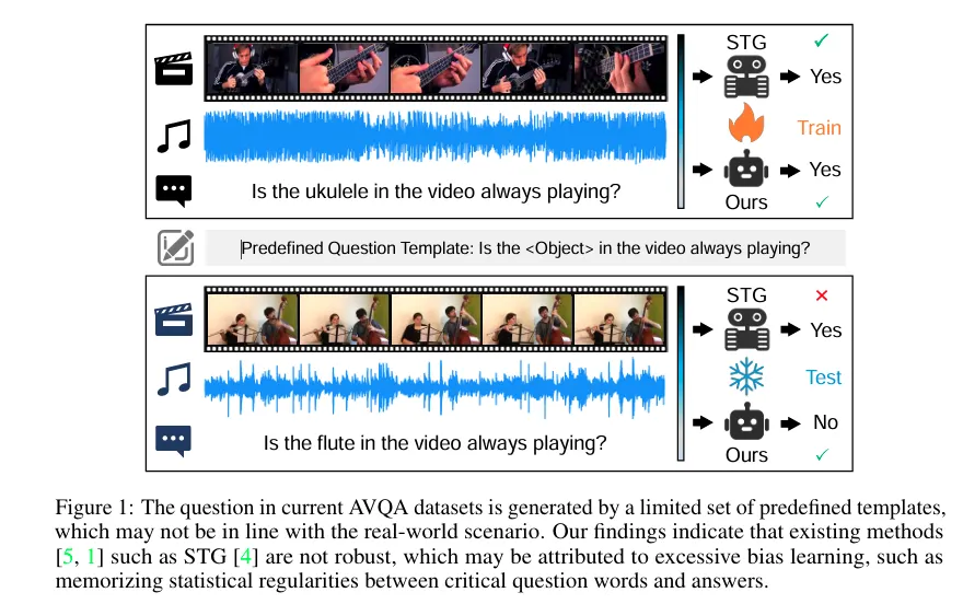 STG 등의 기존 방법들은 희귀 정답이 포함된 질문에는 취약함을 발견했다고 합니다. 이를 저자는 ”is”, “Playing”, ”Yes” 와 같은 핵심 질문 단어와 정답 사이의 통계적 규칙성을 기억하기 때문일 수 있다고 언급합니다. 그러한 증거로 STG 모델은 MUSIC-AVQA 의 테스트 셋에서 질문 문장만 입력했을 때조차 54.09% 의 정확도를 보였기 때문입니다. 이는 멀티모달 추론 문제인 AVQA 태스크에서 질문만으로 절반을 맞춘 것으로 데이터셋 안에 언어적 패턴이 존재함을 뜻합니다.