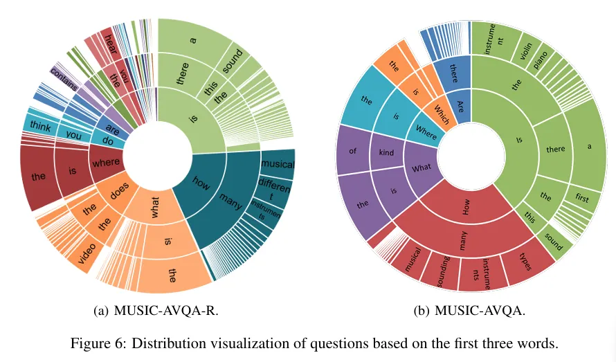 저자의 논문에서는 첫 번째 질문을 정확히 해결하기 위해 새로운 데이터셋인 MUSIC-AVQA-R 을 제안하며 이 데이터셋은 기존 MUSIC-AVQA 를 보완하며 현존 AVQA 모델들의 성능을 보다 정밀하게 진단할 수 있다고 어필합니다. 내재된 편향을 유지하기 위해 원본 MUSIC-AVQA의 훈련 검증 분할은 그대로 사용하고 테스트 분할에서는 human-machine collaboration 매커니즘을 이용해서 질문을 재표현했다고 합니다.
