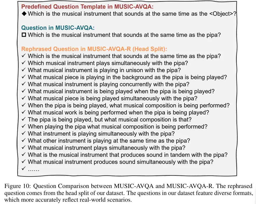 - 공개 데이터셋 MUSIC-AVQA 의 테스트 분할 내 질문들을 Rephrasing 즉 재표현한다.