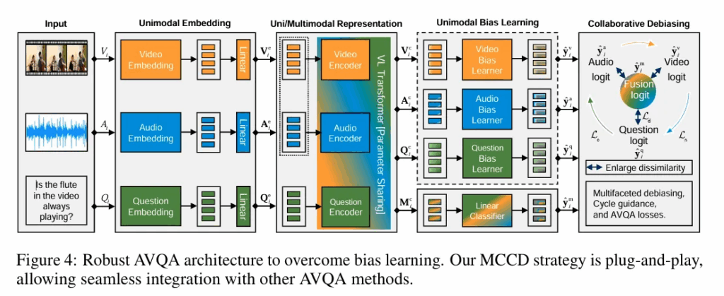 AVQA 에는 오디오,비디오, 언어 각각의 유해한 단일 모달 편향이 존재할 수 있기 때문에 이러한 편향을 포착하기 위한 bias learner를 활용합니다. 구체적으로는 서로 다른 MLP 계층을 편향 학습기로 사용하고 이들은 각각 오디오, 비디오, 질문 모달리티의 입력으로부터 대응되는 로짓을 생성합니다.