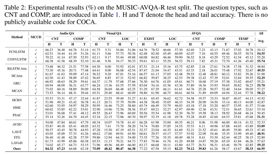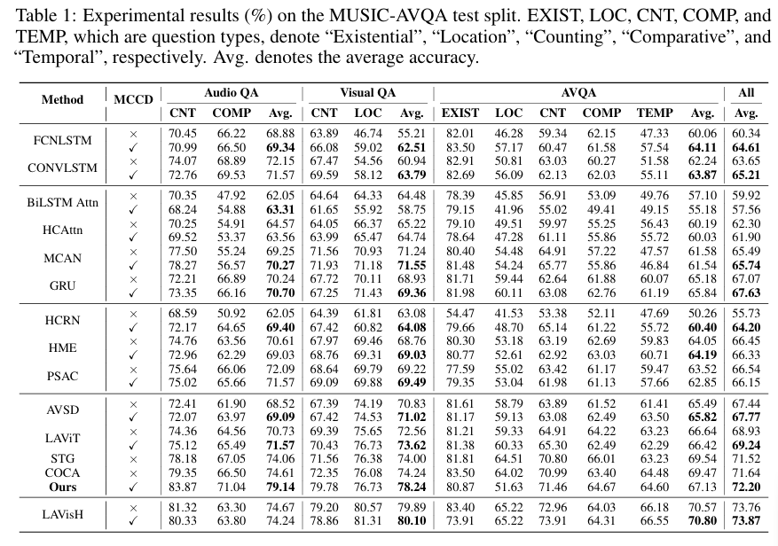 기존의 MUSIC-AVQA test 로 평가한 Table 이며 저자의 MCCD 방법론을 추가하면 전반적으로 성능이 향상됨을 알 수 있습니다.