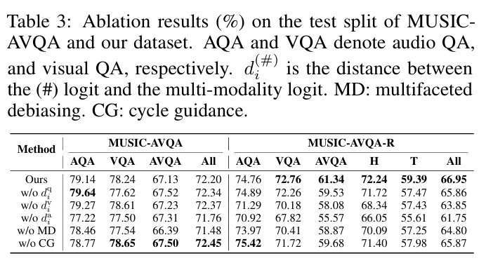 저자는 기존의 데이터셋인 MUSIC-AVQA 과 저자의 데이터셋인 MUSIC-AVQA-R 에 대해 각각 제안된 디바이어싱 전략을 분석하고 기존의 방법론들에도 해당 전략이 잘 통하는지에 대한 ablation까지 진행했다고 합니다.