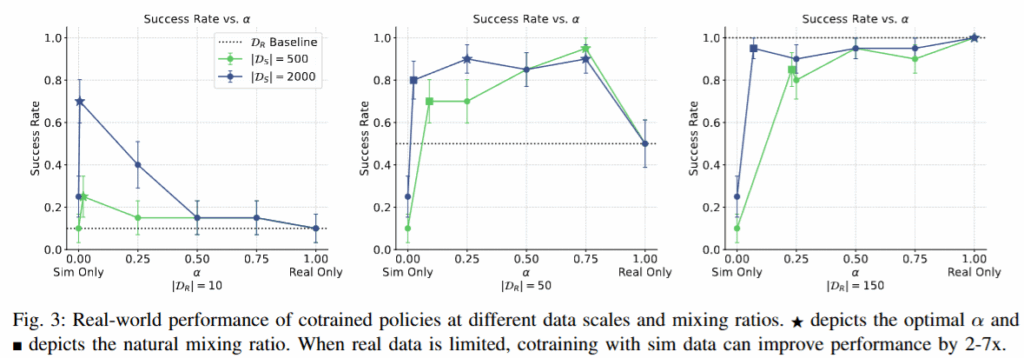 - Co-training을 통해 시뮬레이션 데이터가 현실 데이터의 빈틈을 메우며 현실에서의 성능을 높이는 효과를 보였습니다. 시뮬레이션 데이터의 양이 현실에서의 policy 작동시에 미치는 영향이 어느정도 예측 가능한 양상을 보였고, 현실 데이터의 증가가 갖는 효과의 지수가 더 크게 나타나, 현실 데이터의 중요성도 정량적으로 확인되었습니다.