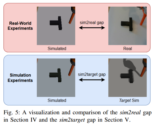 마지막으로는 시각적 격차에 대한 미묘한 효과입니다. 일반적으로 렌더링 품질을 높여 시각적 격차를 줄이면 성능이 개선되는 경향이 있는데, 역설적으로 시각적 격차를 완전히 없앤 정책의 성능은 오히려 약간 떨어졌다고 합니다. 즉 아주 작은 시각적 차이는 도리어 이득이 있었는데, 저자들은 그 이유를 정책이 두 환경을 구별할 수 있는 단서를 남겨두기 때문이라고 해석했습니다. 시각적 차이가 전혀 없으면 정책이 현재 자신이 현실 환경에 있는지 시뮬레이터에 있는지 알 수 없게 되고, 그로 인해 동작 예측에 혼선이 생겨 성능이 저하된다는 가설입니다.