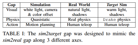 시뮬레이션을 통해서는 효율적인 실험이 가능하기 때문에 저자들은 sim2sim으로도 평가를 진행했다고 합니다. 기본적으로 sim2real gap을 줄일 수 있는지?에 대한 접근이기 때문에 real환경에 해당하는 simulator를 target sim으로 정의하고 기본 sim이 단순화된 물리엔진을 사용한 반면, target sim에는 보다 현실적인 Drake 물리엔진을 탑재한 시뮬레이션을 사용하였다고 합니다. (그림자나 색감, 렌더링 품질을 보시면 될 것 같습니다)시연 데이터 또한 기본 sim의 시연들이 모션 플래너에 의해 생성된 최적 궤적이라면, target sim에서의 시연은 teleoperation을 통해 수집되어 현실 데이터와 유사한 특성을 갖도록 했습니다. 정확한 요소들을 아래 표와같이 구분해두었습니다. Target sim 환경에서 평가를 진행했고, 충분한 평가 통계를 얻기 위해 정책당 무작위 초기조건을 구성해 200회의 에피소드를 실행해 성공률을 계산했다고 합니다. 현실 실험에서는 정책당 20회 평가를 실시했으니 10배 더 많은 에피소드를 통해 분석을 진행했습니다. 다만 이게 애초에 현실과는 다를텐데 어쨌든 domain gap을 해소하는것에 대한 실험 결과로는 인정을 받는 것 같습니다. 이 부분에 대해서 저자들은 explicit control over the sim2real gap between the two cotraining environments이라고 어필했습니다.