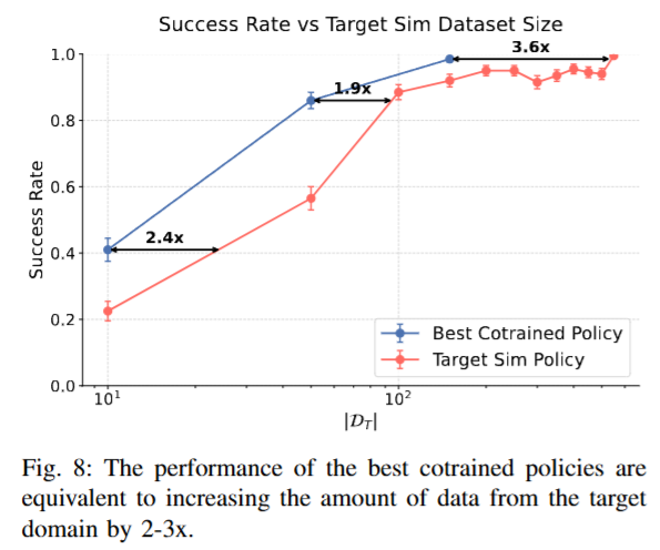 시뮬레이션 데이터를 늘리는 스케일링 실험에서도 현실 실험과 유사한 패턴이 관측되었습니다. D_S를 증가시킬수록 정책 성능이 꾸준히 향상되었지만, 점차 개선 폭이 줄어들며 일정 성능 수준에서 미미해지는 경향을 보였습니다. 이는 시뮬레이션 데이터만으로는 현실 성능을 무한정 높일 수 없고, 결국 현실 데이터의 추가가 있어야 공동학습 성능의 상한선을 끌어올릴 수 있음을 의미합니다. 아래 그래프를 보면 이러한 현상을 각 현실 데이터 크기별로 보여주는데, co-training으로 얻은 최고 성능이 추가 현실 데이터 2~3배를 얻었을 때의 성능과 맞먹는 수준임을 정량적으로 확인할 수 있었습니다. Co-training 150개 target sim 데이터 수준의 성능을 내려면 target sim시뮬레이터 시연만으로는 3.6배 더 필요했다고 합니다. 이 결과는 시뮬레이션 데이터를 통한 co-training이 현실 데이터의 부족을 부분적으로 해소해주는 역할을 함을 볼 수 있습니다. 다만 현실에서는 이미 150개로 success rate가 100인데.. 진짜 현실 데이터는 일단 무조건 중요한 것 같습니다.