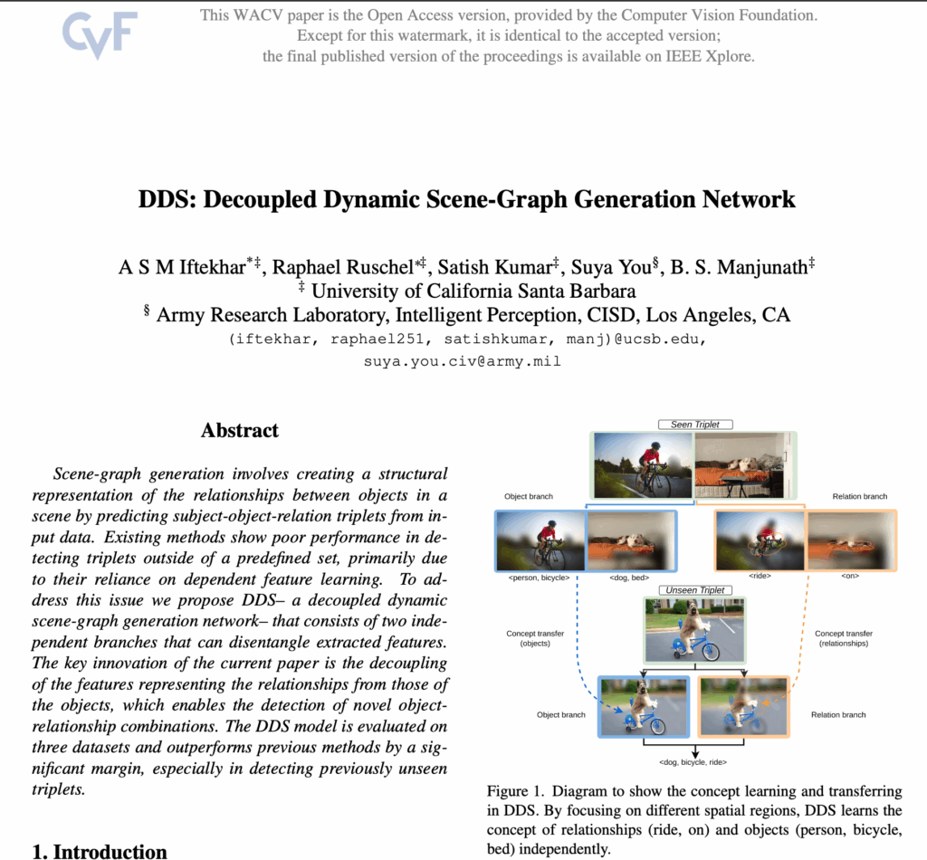 Scene Graph Generation(SGG)은 입력 데이터로부터 물체들을 찾고 이들 간의 관계를 예측해서 장면 내부 물체 간의 관계를 구조적으로 표현하는 task로, 모델은 <subject-relation(predicate)-object> triplet을 잘 예측하는 것을 목표로 합니다. Video Scene Graph Generation(VidSGG. Dynamic SGG로도 표현합니다) 은 비디오 입력에 대해 프레임 단위로 SGG을 수행해서, 각 프레임에서의 물체들 및 이들 간의 관계를 정교하게 예측하고자 합니다. 저자의 문제 정의를 정리하면 ‘현실적인 시나리오를 고려하면 모델이 이전에 보지 못했던 triplet을 잘 예측할 수 있어야 하는데, 기존 방법론들은 학습 과정에 등장하지 않은 triplet에 대한 예측력이 떨어진다’ 입니다. 이는 기존 방법론들의 예측 프레임워크가 주로 ‘물체 검출 -> 물체 검출 결과(보통 검출한 물체들의 feature representation)를 기반으로 relation 예측’하는 구조로 설계되어 물체의 feature representation에 굉장히 의존적이기 때문입니다. 저자는 이 문제를 완화하기 위해 decoupled dynamic scene-graph, DDS를 제안합니다.